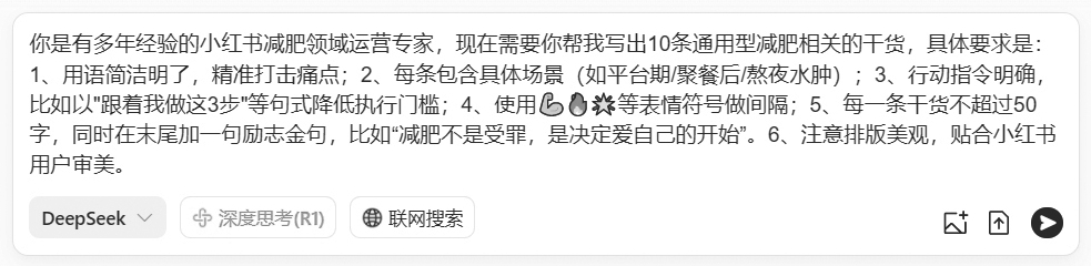 运用AI工具批量化生成减肥文案,已经成为在小红书上实现零成本起号的最佳选择之一。健康、养生等内容,则是视频号的爆款赛道。无论是小红书、视频号,还是抖音、快手,虽然这些平台面向的用户群体各有差异,但内容制作的步骤都是一致的。我们想使用DeepSeek高效完成减肥图文的制作,都离不开以下3步: 撰写减肥文案、生成HTML格式文件、截图保存。