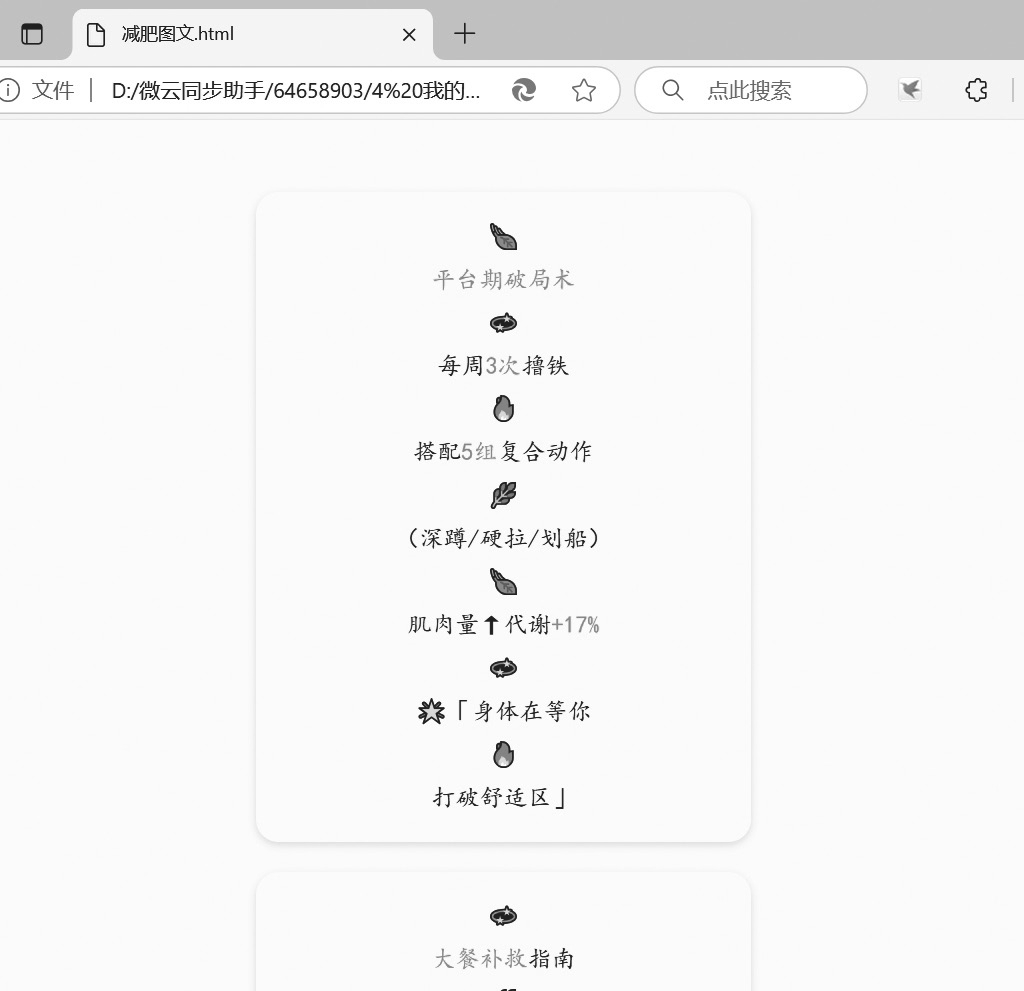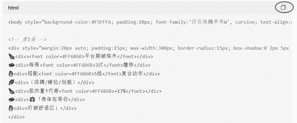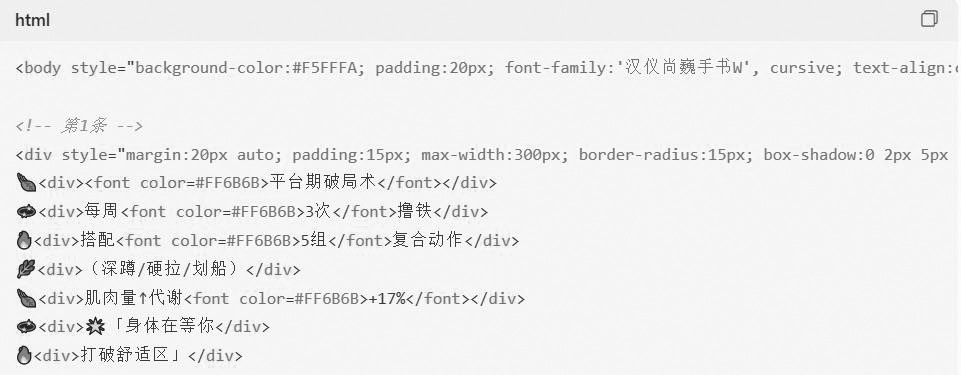 首先,用户提到每行文字用<div>标签包裹。这意味着每个句子或者每个部分都要单独放在里面,可能需要调整原来的文案结构。原来的每条干货信息里可能有多个部分,比如标题、具体建议、表情符号和励志金句,这些都需要拆分成单独的元素。其次,重点数字或重点词要用标红。我需要回顾之前的文案,找出所有需要强调的数字和关键词,比如“3次力量训练”“5个复合动作”“16+8饮食法”等等。这些都需要用红色字体突出显示,这样在小红书上更吸引眼球。