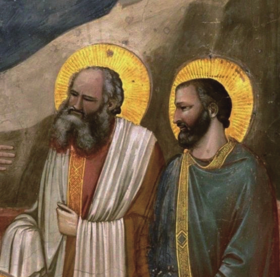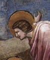 很明显,主角耶稣基督并不在画面的中心,因此乔托在背景里加上了半堵土墙(也可能是土堆),将观众的视线引向画面的主角。