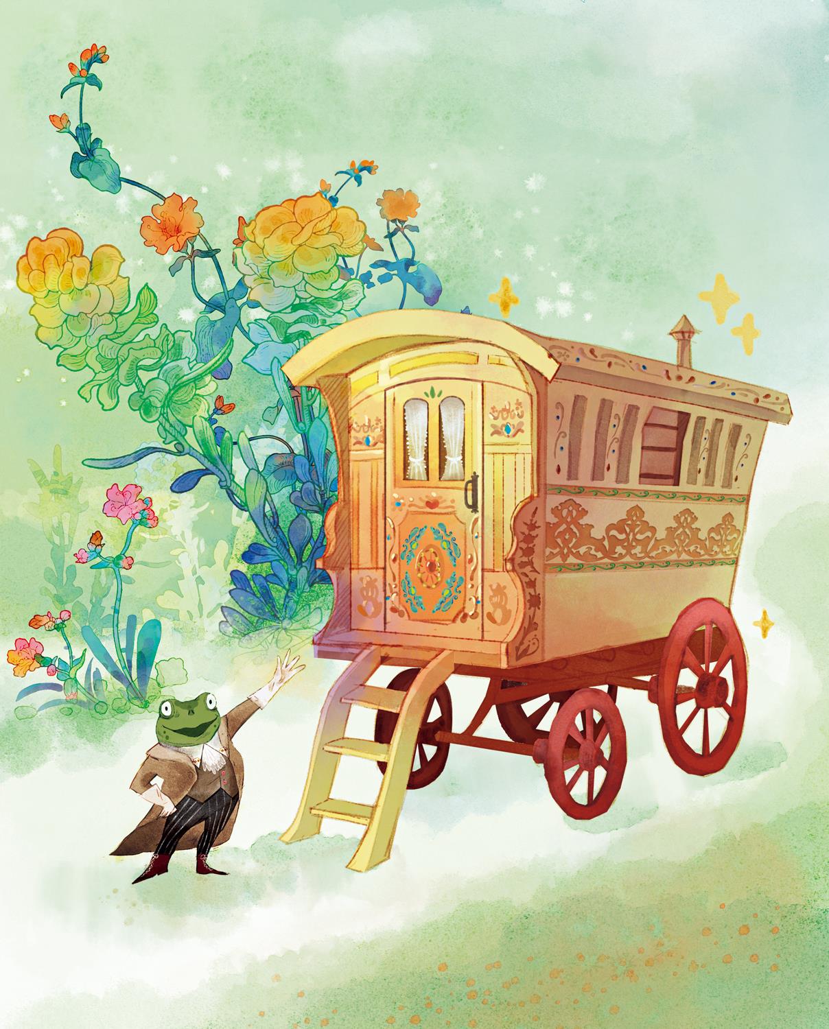 蛤蟆领着他们往马厩走,水鼠一脸怀疑地跟在后面。蛤蟆从马厩里拉出一辆崭新的吉卜赛大篷车,淡黄中带点儿绿色的车身漆得闪闪发亮,轮子则是红色的。