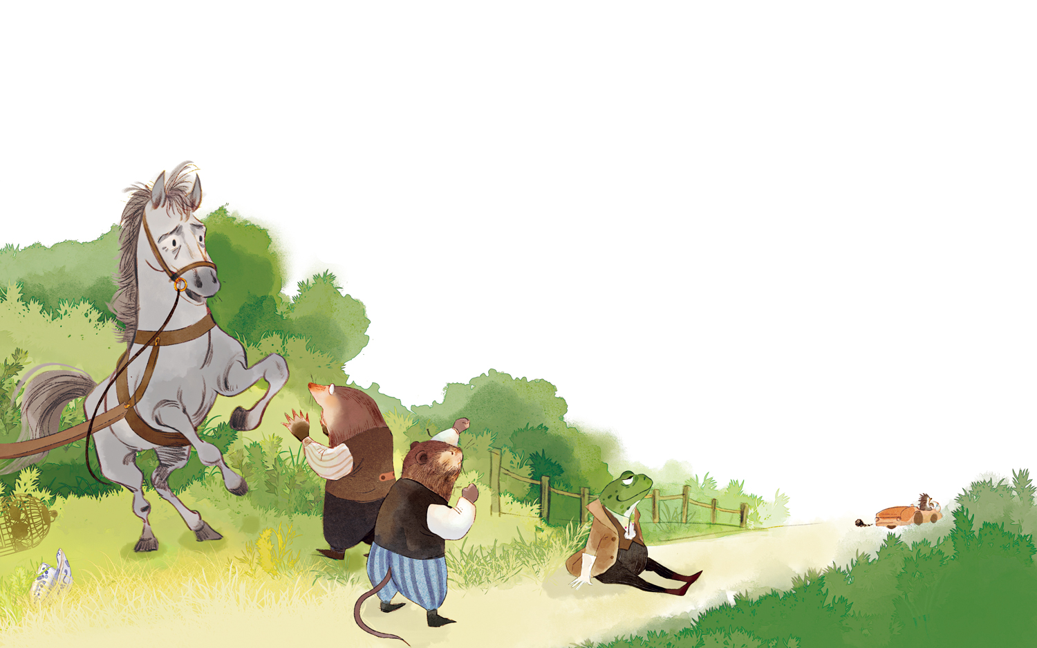 老灰马本来正慢悠悠地踱着步,幻想着自己还在安静的养马场。这突如其来的状况可把他吓坏了,无论鼹鼠怎么拽他的头,说各种动听的话来安抚他的情绪,他都本能地往后退,带着车子,没头没脑地往路旁的深沟里退。车子晃了晃,发出一声令人心碎的巨响后,这辆承载着他们所有骄傲和欢乐的淡黄色大篷车,就四分五裂地躺在沟底,成了一堆无法挽救的残骸。