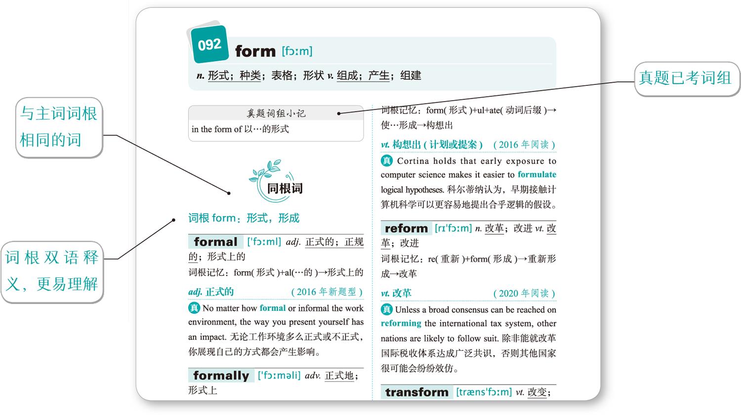 核心词作为全书的重中之重,采用了“恋练有词”经典的 词群记忆法 和 “词根+联想”记忆法 。这部分单词共分为493 组词群,每组词群都围绕一个主词构建而成,包含多个单词;词群内单词也有其内在逻辑,从词形、词根、词义三个维度分为形近词、同根词、相关词。每组词群以主词为干,单词间逻辑为旁支,将原本零散的单词有机串联,单词一记就是一串。同时,对于适合采用词根和联想记忆法的单词,也给出了相应的助记法。 科学背词,必然高效!