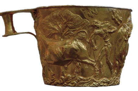 最近在希腊南部土中发掘一只黄金杯,上刻精妙的野牛图,充满于现代的优美与洗练。现藏雅典博物馆中。