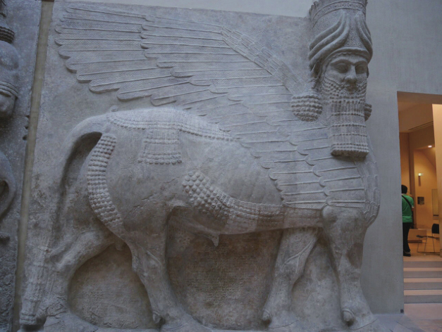 游伦敦大英博物馆或巴黎罗佛尔博物馆的人,走进其巴比伦亚细里亚室的时候,一定吃惊于其中的奇怪的巨像。大英博物馆中的人面大牡牛,尤为奇观:背有长翼,腿有五条,高一丈余,狞恶地俯视游客。旁边还有生翼的裸体巨人作同样狞恶的相貌而立着。这是什么东西呢?这是距今约二千六七百年前亚细里亚(Assyria)王