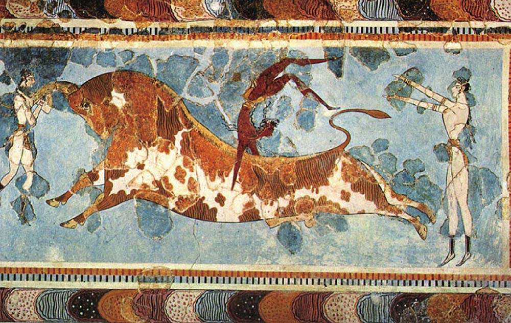 这黄金杯就是在附近的巴菲沃(Vaphio)地方发见的二杯之一,世称为珍物中的珍物。这文化果自何而来?据英人爱文斯考究,连结特洛伊与迈锡尼的爱琴海的文化渊源,确在于克里特岛,自一八九四年以来,他常在这岛上探索,发掘。这不是徒劳,他终于在那里探得了希腊神话中有名的“怪牛”(Minotaur)的居城“迷宫”(Labyrinth)的实迹,解释了五千年来的谜。那地方就是旧都克诺索斯(Knossus)。许多鲜丽的壁画,巨大的“怪牛”的图就在其中掘得。又在室中发见许多鲜明美形的瓶,象牙雕的小女神像(现藏波士顿博物馆),蜂腰长裳,宛如现代妇人。