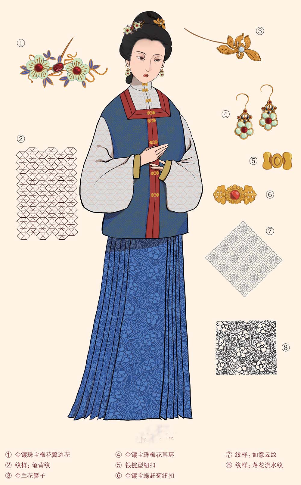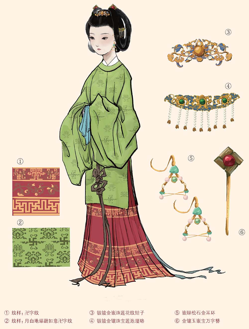 这样一个被忽视的女孩子,在迎接远方表姊妹的隆重场合,会怎么穿戴呢?或许,她发髻上斜插着攒珠累丝金凤钗、银镀金嵌珠莲花纹结子、银镀金镶珠宝莲池璎珞,戴着明清时期常见的金镶宝八珠耳环,内着白色交领中单,外罩黄色圆领袍,下搭翠绿色马面裙,裙上织着灵芝方胜纹