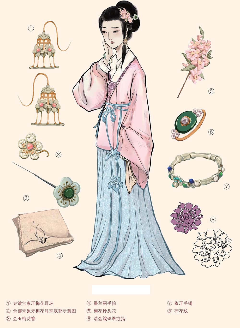 金玉梅花簪和金镶宝梅花耳环的设计中,梅花都是主纹样。黛玉曾在咏海棠诗中写到“偷来梨蕊三分白,借得梅花一缕魂”,梅花孤傲、清冷的气质正如黛玉灵魂的写照,所以这两样首饰的设计是以白玉衬其美好,梅花点其清丽。
