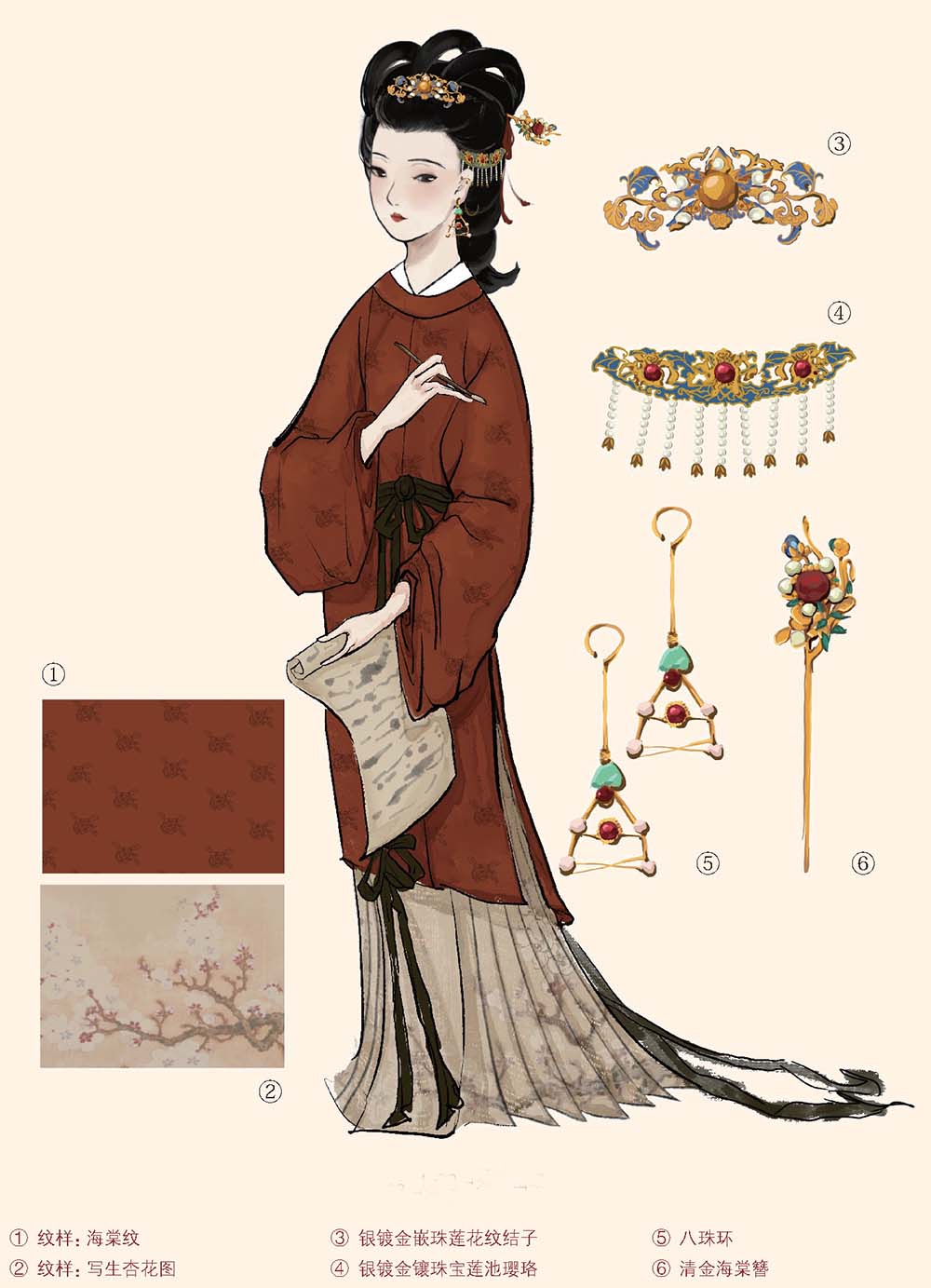 同样面对复杂的生活环境,如果说迎春的策略是忍,惜春的策略是冷,探春的策略则是硬,庶女出身让她格外敏感,转而格外强硬地捍卫自己名门千金的身份。所以在管家过程中,她痛斥前来搅局的生母;抄检大观园时,面对邢夫人陪房的挑衅,探春果断出手,以一记响亮的耳光再次昭告她千金小姐身份的不可撼动。强硬的处事风格和闺阁少女的青葱年龄形成了强烈对比,让我们感受到埋藏在三小姐心中的痛苦和不甘。这样一个女孩子,在迎接远道而来的表姐时,是什么心态呢?书里写她“削肩细腰,长挑身材,鸭蛋脸面,俊眼修眉,顾盼神飞,文彩精华,见之忘俗”,想来,在这种重要场合,探春既是淡定自如的,也是敏锐细心的,眼睛看着表姐,心里却无时无刻不在关注着老祖宗和王夫人吧。在迎接黛玉的众裙钗中,她的装扮令人眼前一亮:发髻上插金海棠嵌紫宝石簪,和堂姐、堂妹一样戴银镀金嵌珠莲花纹结子、银镀金镶珠宝莲池璎珞,耳戴八珠环。内穿白色交领中单,外罩深红色圆领袍,衣面上织着海棠纹;下搭米色马面裙,裙面上是杏花纹 (图1.28) 。