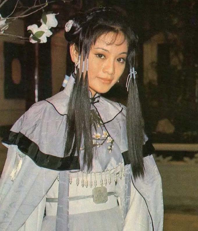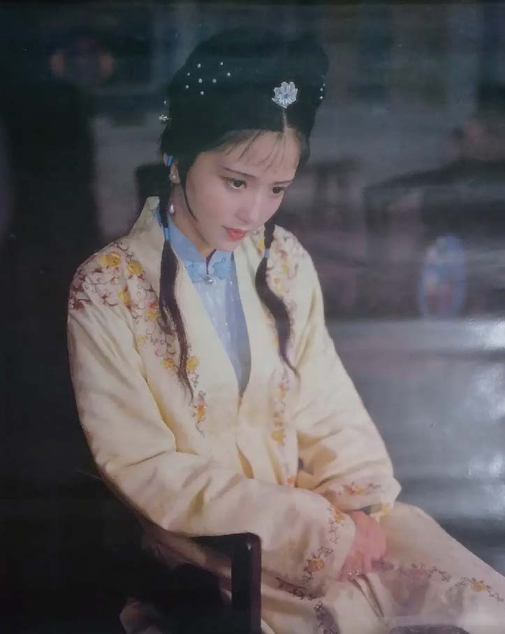 ;1989年版《红楼梦》电影中,林黛玉身穿淡黄底子连枝花叶纹样镶边披风、蔚蓝绸面偏襟对眉立领袄子和银白绸面细褶裙