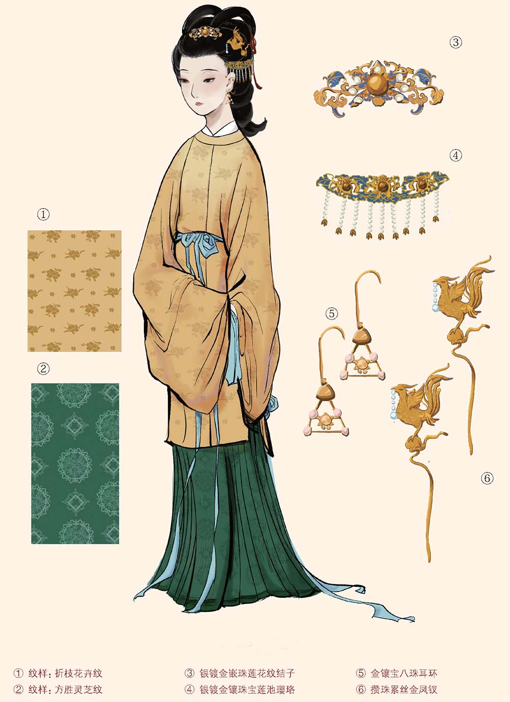 这样一个被忽视的女孩子,在迎接远方表姊妹的隆重场合,会怎么穿戴呢?或许,她发髻上斜插着攒珠累丝金凤钗、银镀金嵌珠莲花纹结子、银镀金镶珠宝莲池璎珞,戴着明清时期常见的金镶宝八珠耳环,内着白色交领中单,外罩黄色圆领袍,下搭翠绿色马面裙,裙上织着灵芝方胜纹