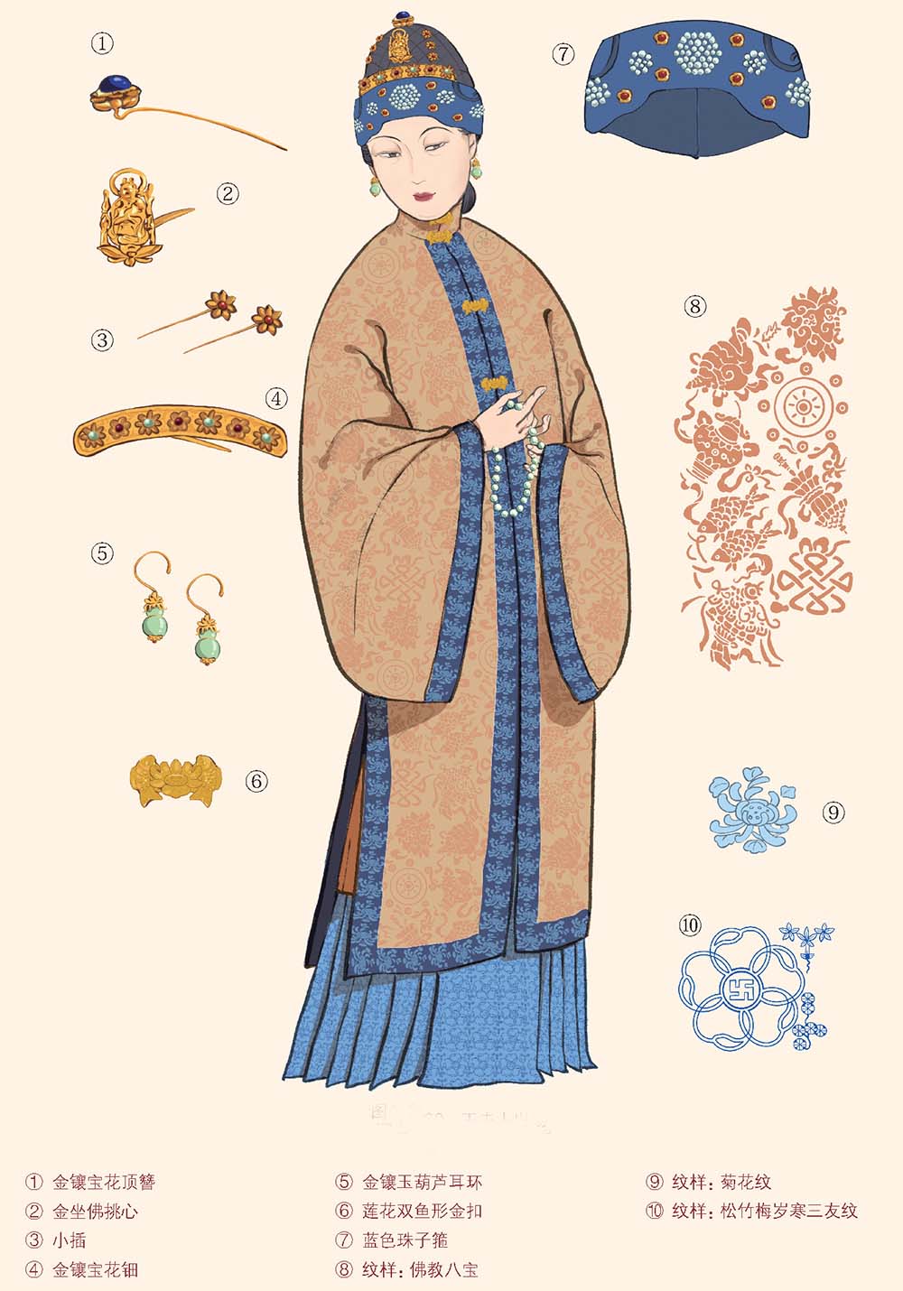 这位中年贵妇头戴䯼髻,插金镶宝花钿,额头裹着蓝色珠子箍,戴一对金镶玉葫芦耳环,身穿秋香色立领对襟大袖衫,系莲花双鱼形金扣,蓝锦缘边,锦上织菊花纹,下搭蓝色马面裙。䯼髻的挑心是佛像,大袖衫上织着佛教八宝吉祥纹样,包括宝伞、金鱼、宝瓶、莲花、白海螺、盘长、胜利幢、金轮等,马面裙上平织松竹梅岁寒三友纹和万字纹 (图1.30) 。王夫人的服饰比较符合原书对她吃斋念佛的描述,葫芦寓意福禄,佛教八宝吉祥纹和万字纹都寓意着智慧和慈悲,但综合来看,身处末世,感受到贾府倾颓之势的王夫人诸事繁忙,虽有向佛之意,却身心困顿,行事混乱,抄检大观园即为一例。而七十七回更提到,抄检大观园后,王夫人将芳官等人撵出怡红院,让她们的干娘领去嫁人,芳官等则闹着要做尼姑,王夫人的第一反应是不允许,原来她觉得芳官等太年轻,进入佛门恐非了局。但水月庵和地藏庵的老尼姑们想要徒弟使唤,反复进言,又正逢邢夫人接回迎春以备人相看、官媒求说探春之时,王夫人心绪烦恼,因此不在意芳官等出家小事,最后还是让她们随老尼姑去了。在这段交流过程中,王夫人态度反复,情绪在不忍心和不在意之间波动,对芳官等小丫头们始终存着一丝善念,矛盾之中显出她人性的复杂。她或许并不是存心要置金钏、晴雯、芳官等于死地,只是在那无趣的人世间,她能抓住的东西实在太少,唯有牢牢抓住宝玉,以寻求最后的安全感。为此,所有在她看来妨碍他们母子前程的人事都要被清扫隔离,当她得知那些被赶走丫鬟们的不幸下场时,或许也会闪过一丝不忍吧,但终究荣国府小姐公子们的事情,才是她心头要紧之事,那些丫头们如同小猫小狗,也就随她们去吧。佛说众生平等,一心向佛的王夫人终究还是没有参透佛理,但说到底,置身于滚滚红尘被名枷利锁拘住的,又何止她一人呢……