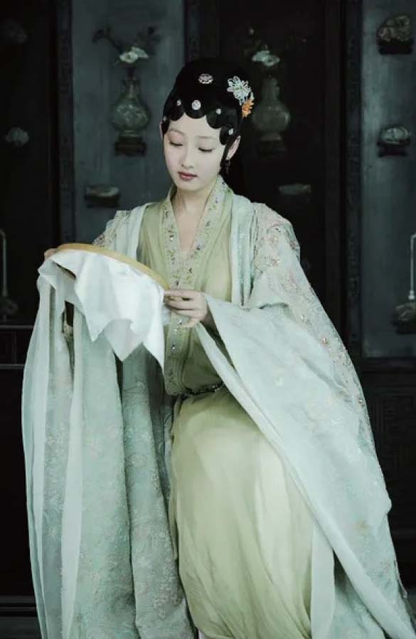 她上身穿浅粉色交领袄,衣领上绣着荷花纹,下衬蓝色百褶裙,裙上织着龟甲纹,垂下的一方素帕上画着墨兰,衬出大家闺秀幽静娴雅的仪态。她手托香腮,眉尖若蹙,一副弱不胜衣的娇俏模样,仿佛唐寅《美人思春图》中的仕女。这样的仕女走出美人图,走进贾府,纵然荣国府内一众女眷早已见过无数出色闺秀,但看到这般气质出众的女孩儿,仍然免不了会夸赞一句“这通身的气派,竟不像老祖宗的外孙女儿,竟是个嫡亲的孙女”,虽然有讨老祖宗欢心之意,但也从侧面肯定了林黛玉的卓尔不凡。衣领上的那些缠枝荷花纹,色泽鲜艳,光彩照人,让人想起那句浅浅嗔怪,“我最不喜欢李义山的诗,只喜他这一句:‘留得残荷听雨声’。偏你们又不留着残荷了”,一个才华横溢、孤傲自许的小才女形象跳出纸面,栩栩如生。