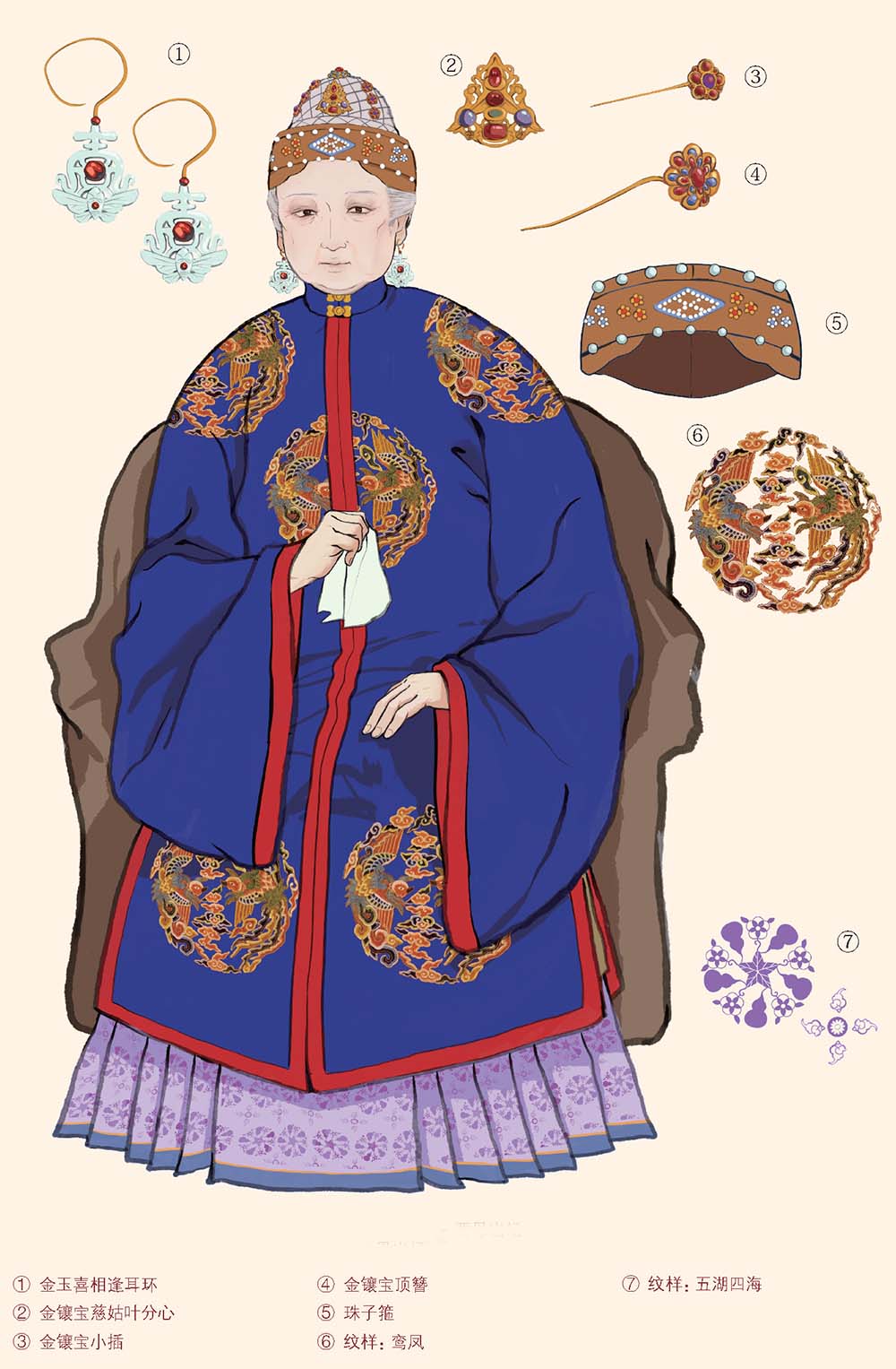 裹着绛色箍儿,外罩一件蓝色缕金八团花立领对襟大袖衫,下搭淡紫色马面裙、蓝灰色缘边,外表仿佛慈祥观音,内中不乏霹雳手段。她衣身上的团花纹是鸾凤纹,马面裙上是五湖四海纹,都有吉祥和睦之意。为迎接心爱的外孙女,老人家特意戴上了一对金玉喜相逢耳坠,分明映衬着老祖宗内心的喜悦和期待