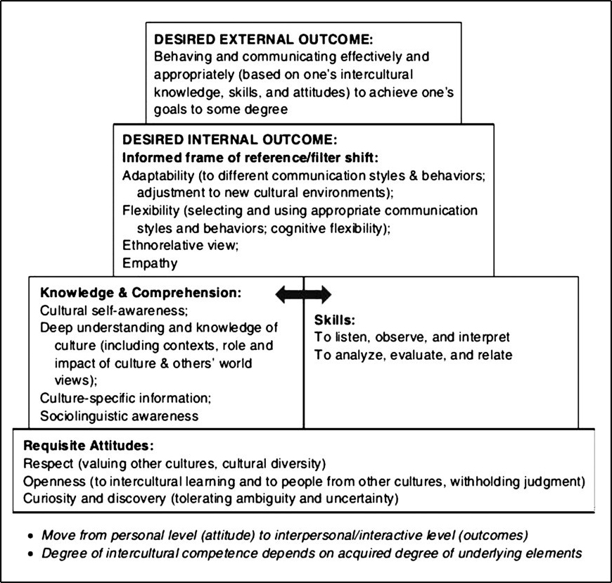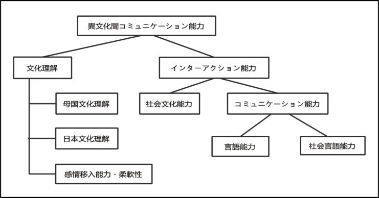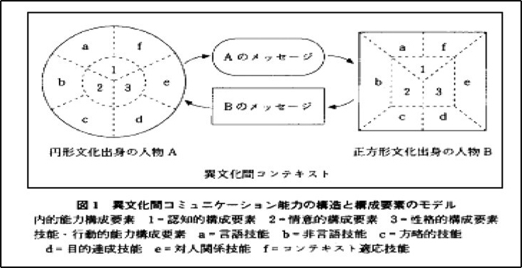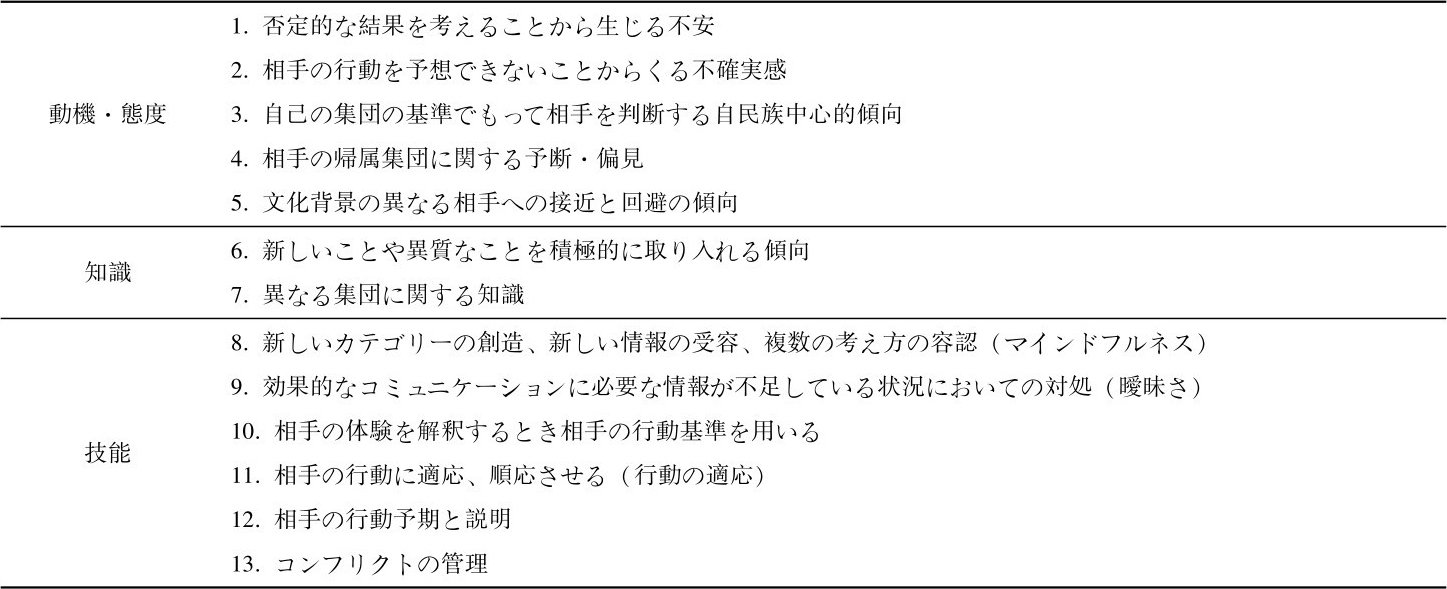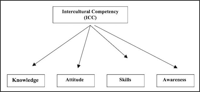 ICC能力を認知(知識)·情意(情緒)·行為(スキル)の3つの側面を通じて分析したものである。異なる文化で有効に、適切にコミュニケーションができるように、この3つの側面に関わる要素がともに発展する。