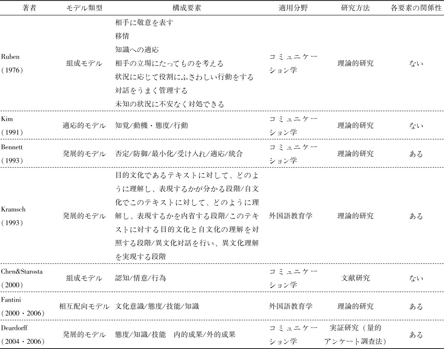 次に、Kim(1991)が提唱したICC能力のモデルについて、西田(1998∶88-89)を参照し、【表2-7】にまとめた。