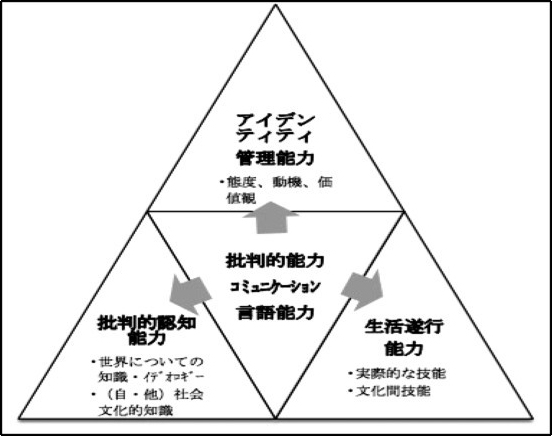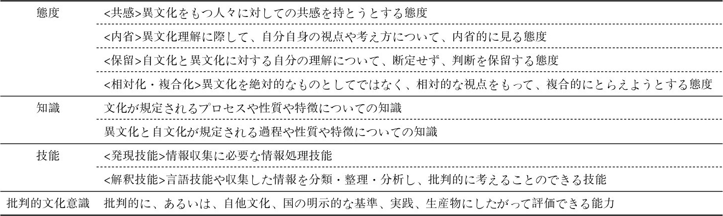 ‘批判的文化意識’については、松本(2013∶52)が‘この意識を持つということは、対象を批判的、分析的に評価する際に、多様な文化の基準、観点、実践、事物などを偏見なく比較、対照、検証し、そこから自分が拠って立つ判断の規範を導くと同時に、自分の考え方と違うものを受容し、そこに矛盾や軋轢が生じた時には解決に向かって客観的かつ冷静な交渉ができることである’と説明している。