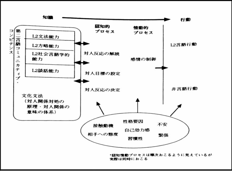 【図2-21】に示すように、第二言語コミュニカティブ·コンピテンスでは‘文法能力’·‘方略能力’·‘社会言語学的能力’·‘談話能力’を構成するコミュニケーション能力に目標文化社会の‘文化文法’を加えている。この‘文化文法’は、特定文化コンテキストにおける対人関係樹立に役に立てるコミュニケーション·スタイルとして考えてもいい。それに、第二言語コミュニカティブ·コンピテンスのほか、異文化適応するための感情の面、性格の面、非言語コミュニケーションの面に必要とする心理的な要因が含まれている。