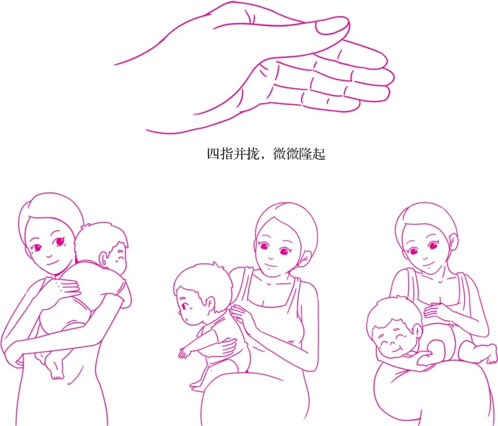 (5)每次吃完奶,竖直抱着宝宝,轻轻拍他的后背,拍5分钟左右就把宝宝放下,这种拍嗝方法最常用,可以有效防止刚吃饱后就躺下奶液从胃里反流出来引起吐奶,但是要注意不要竖直抱着时间太长,否则会给宝宝还未发育好的脊柱增加负担。