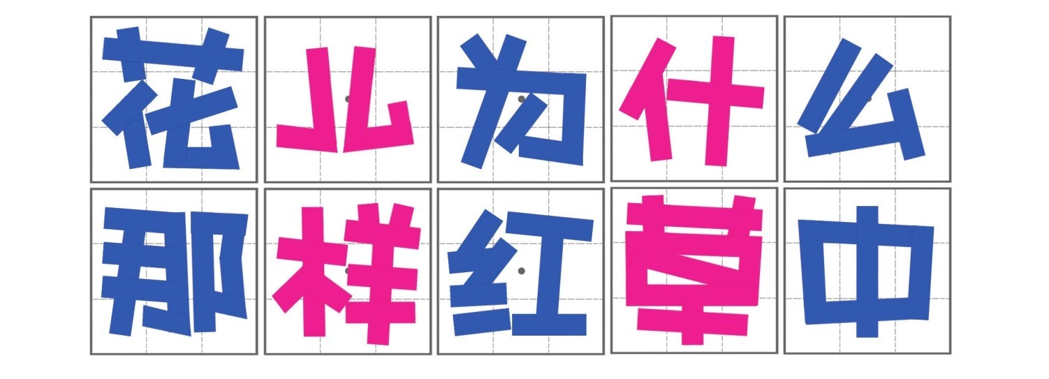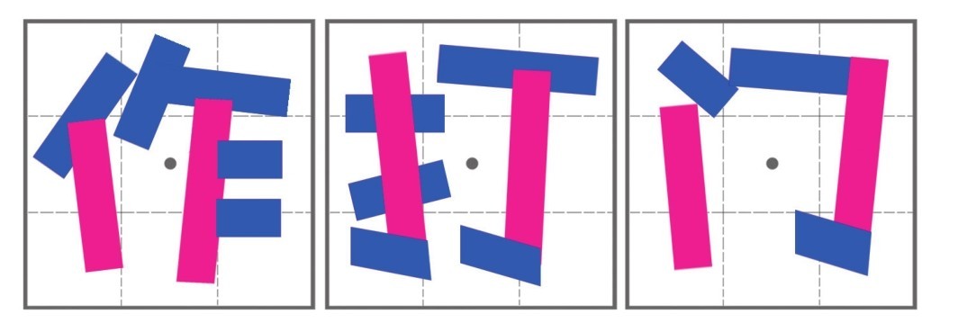 活变体字的字体结构呈倒梯形,其中横和竖进行相对夸张的变化,其他笔画按活体字笔画书写。