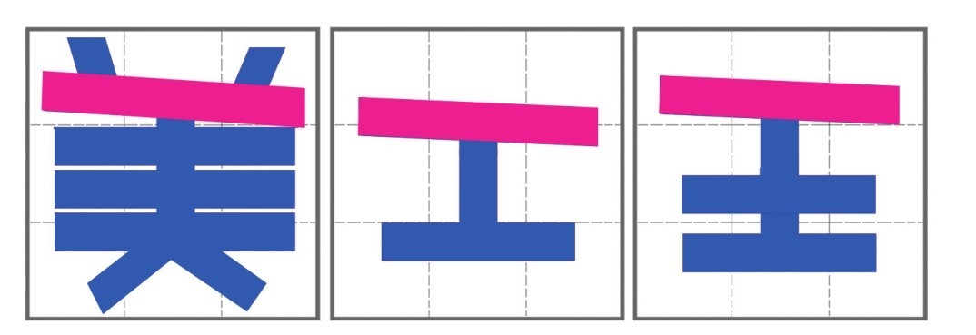 最上面的横在拉宽的同时左高右低倾斜,其他横缩短且保持水平状态。