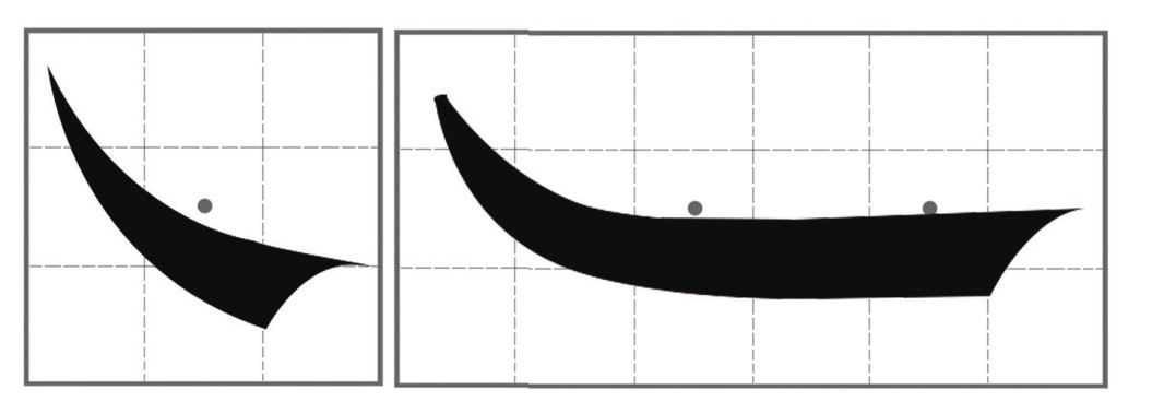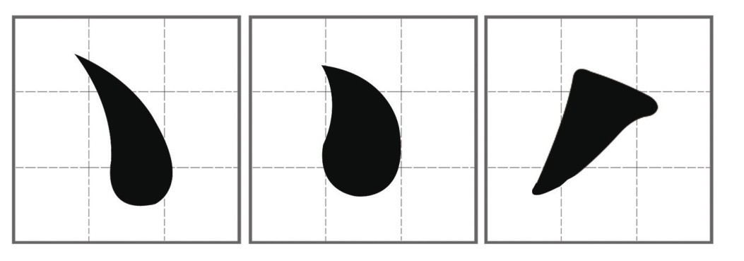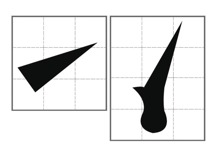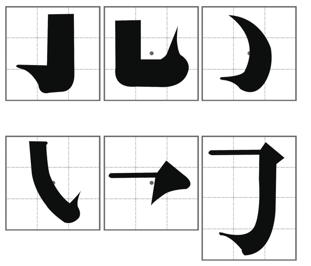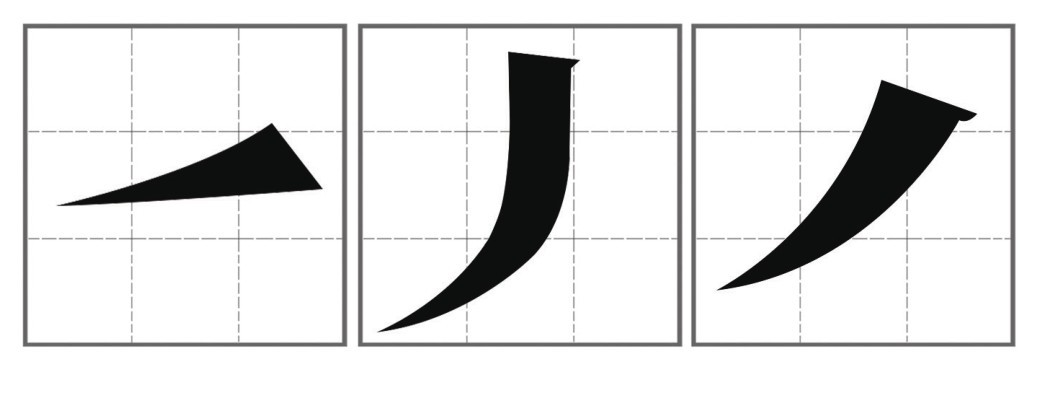 细起笔,向右下角加粗拉伸,末段笔触上端呈锐角,下端呈钝角。