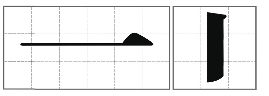 横水平且细,而且末端有一个小山一样的装饰角;竖垂直且粗,而且上端有一向右下倾斜的小钝角,下端有一向左下角倾斜的弧度。