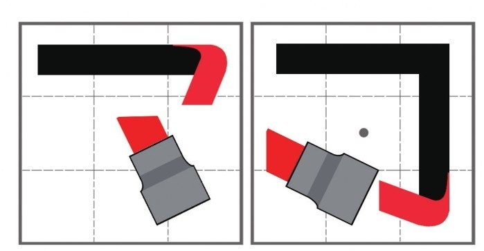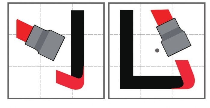 先完成垂直竖和水平横组合的直角的竖折,然后笔头水平由左上角向右下角写出圆角的钩。
