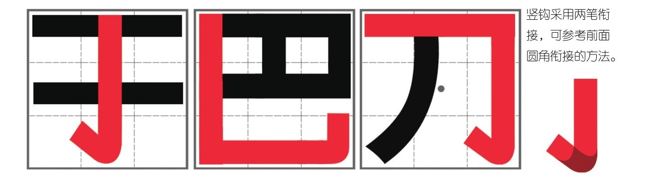黑体字里,钩要保持圆角衔接,比如竖钩、竖折钩、横钩、横折钩;折保持直角衔接,比如竖折和横折。