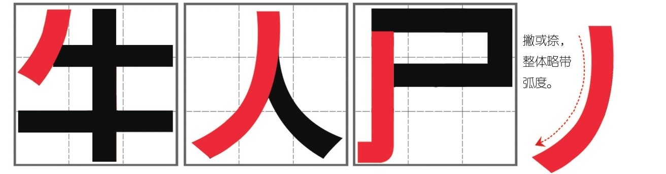 黑体字里,撇和捺要带有弧度,竖撇可以当作竖钩进行书写。
