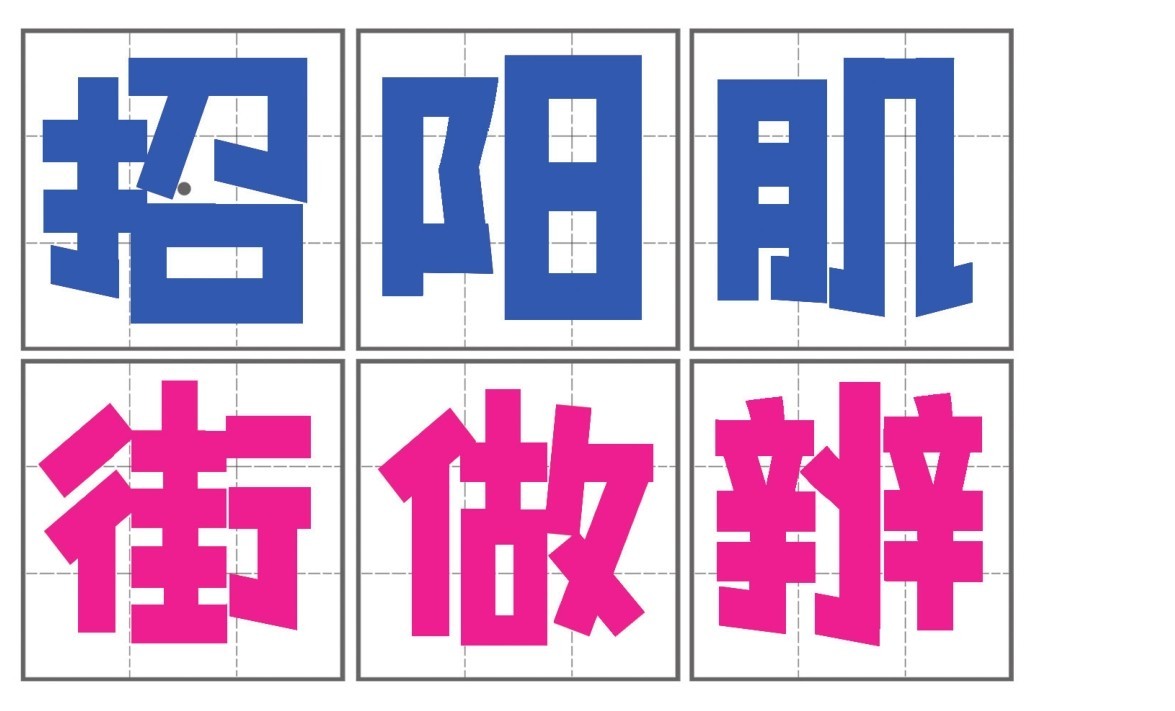活体字是以黑变体字为基础演变过来的,黑变体字和黑体字上下宽度一致,方方正正,而活体字则呈现上宽下窄、上大下小的倒梯形结构,是头大身子小的卡通风格,在笔画上和黑变体字一样,除了保持横平竖直之外,把撇、捺、钩等笔画拉直书写。
