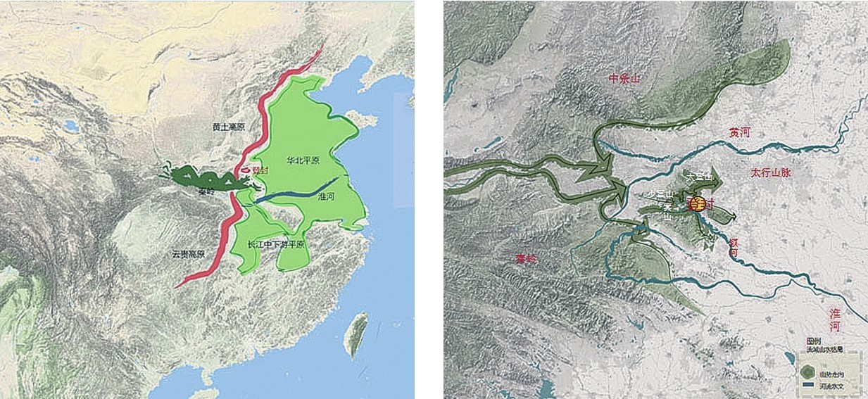 登封市位于南北走向的中国地理第二阶梯和第三阶梯分界线上,同时也靠近东西走向的中国南北方分界线;地形地势丰富,包括深山、浅山、丘陵和平地4种地形,城外太行山与秦岭两大山脉绵延耸立,淮河水系纵横交错(图3-1);城中由南北向中间逐渐降低,中有数条河流蜿蜒穿过。登封市是中国三大主流文明儒、佛、道的源头和三教集大成之地,也是古人丈量天地、蠡测宇宙的中心。中国古人向来极为重视山水格局与文化行为之间的关联,在登封市发生如此众多的重大文化行为,与古人对其山水格局的认知评价有关。因此,选取登封市作为案例城市进行山水格局多尺度数字化解析,有益于探索中国传统营城智慧。