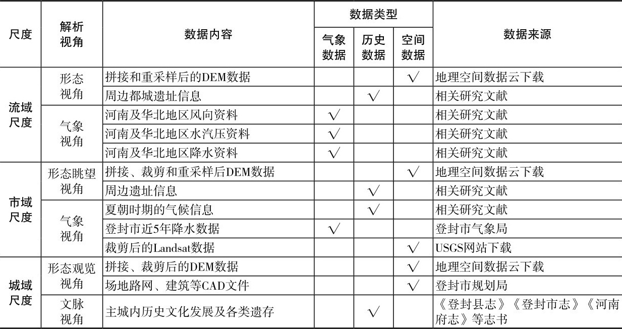 根据尺度划分环节确定的各尺度空间范围、解析对象,进行数据集构建,包括基础数据采集与前期分析处理(表3-2)。基础数据包括气象数据、历史数据、空间数据三类,部分数据需要依托ArcGIS、ENVI、Matlab等平台进行预处理,包括数据清洗、整合、运算等,尤其是DEM数据。