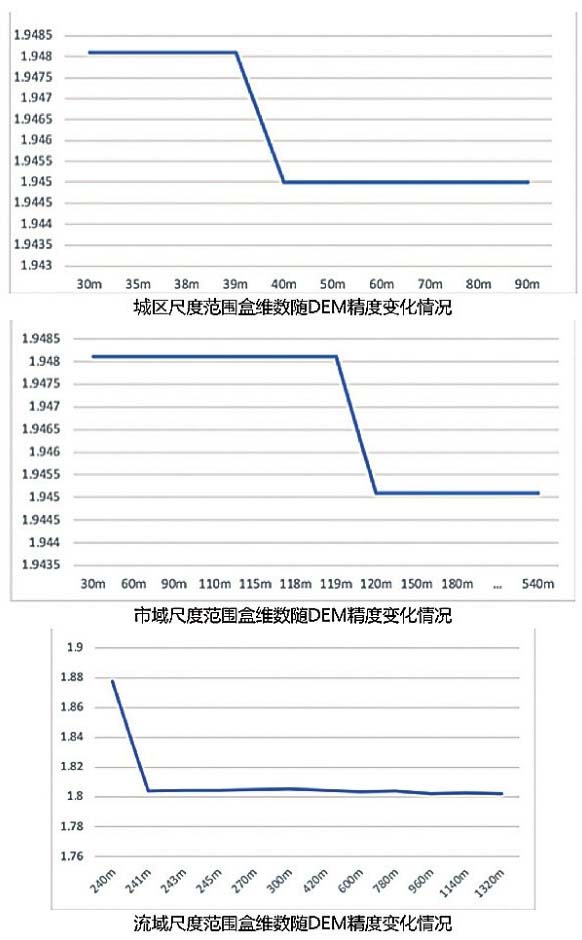 如前文所述,尺度具有分形特征,而DEM数据具有尺度效应,因此,数据往往并非精度越高越好,随着分析对应的地理空间范围的增大,所采用的DEM数据精度应当相应减少,以避免细节数据冗余造成的计算压力和趋势分散。故本研究通过分形维数计算尺度转折点,以确定各尺度下所采用的DEM数据精度。