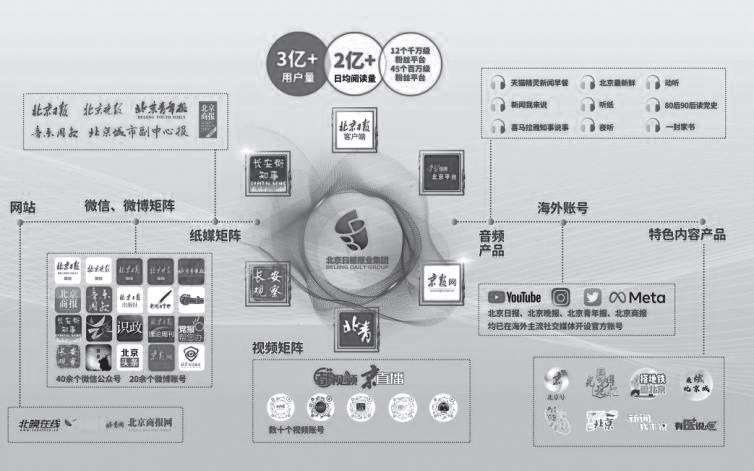 以京报品牌为引领,实现报、网、端、微、号等不同渠道互联互通,涌现出大批阅读量过千万、过亿的爆款产品。其中,北京日报客户端作为集团移动传播龙头平台,权威首发优势不断凸显,全年阅读量同比增长216%,下载量超2388万次;北京青年报客户端增设“青春派”频道,扩大青年新闻、青年文化传播力,下载量超2000万次;长安街知事持续为多平台打造定制视频栏目,全网用户超3200万,传播力影响力位居全国时政类新媒体前列;北京日报、北京晚报微博微信强化与各平台账号联动,为优质内容引流,粉丝总量超3100万,全年阅读量超百亿次;“学习强国”北京学习平台月浏览量超3亿次,稳居全国前列。