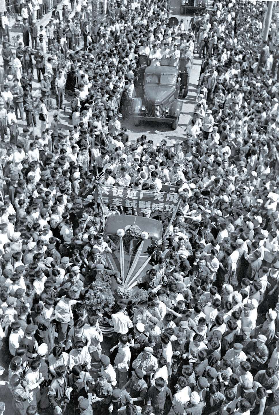 ◎1956 年 7 月 15 日,长春第一汽车制造厂生产出中国第一辆解放牌汽车,结束了中国不能生产汽车的历史。图为第一批国产解放牌载重汽车出厂时,全厂职工夹道欢迎
