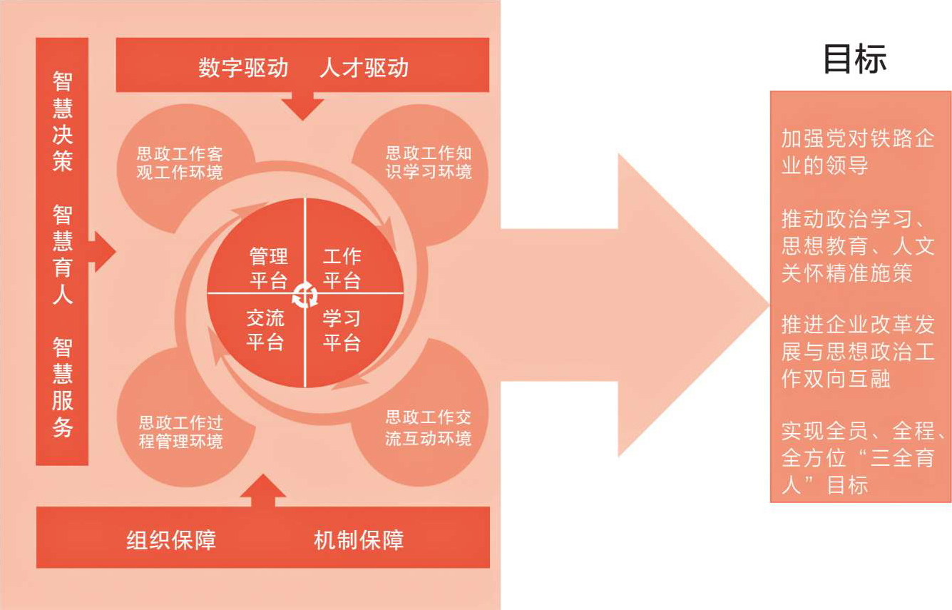 以中国铁路南宁局集团有限公司为代表的铁路企业,打造“4232”铁路智慧思政工作体系,建设学习、工作、管理、交流四大平台模块,以数字驱动和人才驱动为基础,以实现智慧决策、智慧育人、智慧服务为主要功能,对铁路思想政治工作的客观工作环境、知识学习环境、过程管理环境、交流互动环境进行智能化升级,强化组织保障、机制保障,促进数字化管理,以加强党对铁路企业的领导,推动政治学习、思想教育、人文关怀精准施策,推进企业改革发展与思想政治工作双向互融,实现思想政治工作全员、全程、全方位“三全育人”目标。