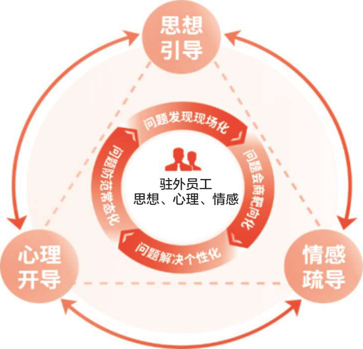 1.问题发现现场化。(1)压实现场工作责任。驻外机构负责人既要管业务,也要管思想政治工作,及时了解驻外员工思想、心理和情感状况,开展经常性思想动态分析、员工心理画像和异常情绪疏导。(2)配齐现场工作队伍。安排境外党组织书记、委员及人力资源、党群工作人员,兼职负责驻外员工思想、心理和情感工作。引入心理健康管理专业机构,跟进为驻外员工提供咨询、分析和关怀服务。(3)丰富现场工作手段。充分运用党建云平台、心理热线等专业化、智能化工具的同时,继续用好谈心谈话、组织生活会、批评与自我批评等我党传统工作法宝,把驻外员工的思想困惑、心理压力和负面情绪控制在现场范围内。