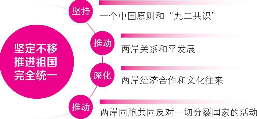 保持香港、澳门长期繁荣稳定,实现祖国完全统一,是实现中华民族伟大复兴的必然要求。必须把维护中央对香港、澳门特别行政区全面管治权和保障特别行政区高度自治权有机结合起来,确保“一国两制”方针不会变、不动摇,确保“一国两制”实践不变形、不走样。必须坚持一个中国原则,坚持“九二共识”,推动两岸关系和平发展,深化两岸经济合作和文化往来,推动两岸同胞共同反对一切分裂国家的活动,共同为实现中华民族伟大复兴而奋斗。