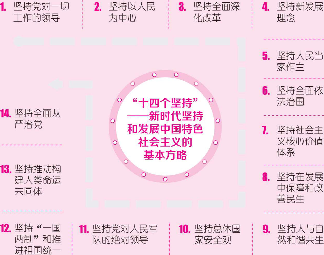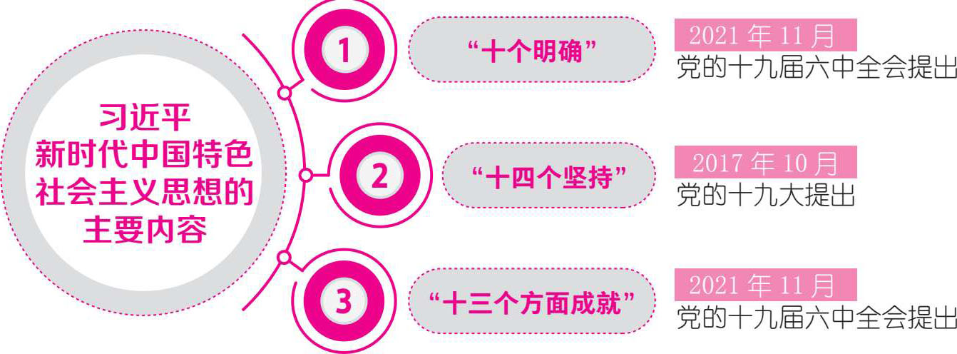 党的二十大报告指出,“十九大、十九届六中全会提出的‘十个明确’、‘十四个坚持’、‘十三个方面成就’概括了这一思想的主要内容”。