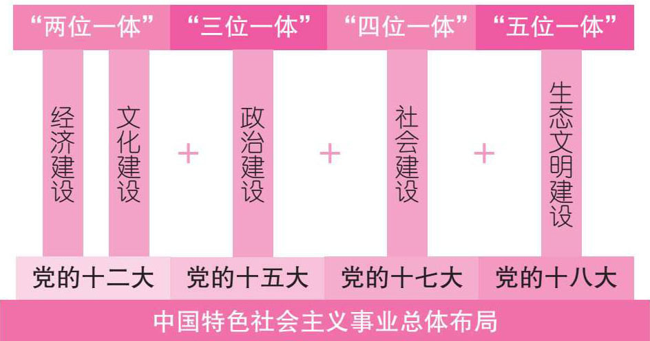 关于中国特色社会主义事业总体布局,改革开放以来,我们党经历了逐步深化、不断完善的过程。从物质文明、精神文明“两个文明”,到经济、政治、文化建设“三位一体”,经济、政治、文化、社会建设“四位一体”,再到经济、政治、文化、社会、生态文明建设“五位一体”,体现了党对发展理论的重大创新和发展理念的深刻转变。“五位一体”总体布局的形成,标志着我们党对共产党执政规律、社会主义建设规律、人类社会发展规律的认识达到了新的高度。