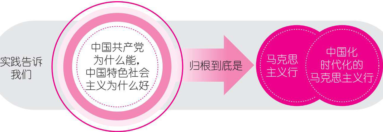 实践告诉我们,中国共产党为什么能,中国特色社会主义为什么好,归根到底是马克思主义行,是中国化时代化的马克思主义行。百余年来,我们党之所以能够创造新民主主义革命、社会主义革命和建设、改革开放和社会主义现代化建设、新时代中国特色社会主义的伟大成就,之所以能够领导人民在一次次求索、一次次挫折、一次次开拓中完成中国其他各种政治力量不可能完成的艰巨任务,根本在于我们党始终把马克思主义作为立党立国、兴党兴国的根本指导思想,作为认识世界、把握规律、追求真理、改造世界的强大思想武器,以创新的理论及时回答时代之问、人民之问,成功探索出走向胜利的正确道路。