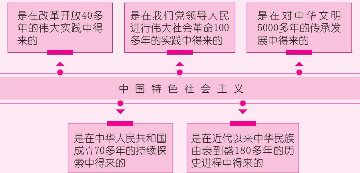 在庆祝中国共产党成立 100 周年大会上,习近平总书记在深刻总结我们党 100 年来开辟的伟大道路、创造的伟大事业时指出:“走自己的路,是党的全部理论和实践立足点,更是党百年奋斗得出的历史结论。”中国特色社会主义不是从天上掉下来的,而是在改革开放 40多年的伟大实践中得来的,是在中华人民共和国成立 70 多年的持续探索中得来的,是在我们党领导人民进行伟大社会革命 100 多年的实践中得来的,是在近代以来中华民族由衰到盛 180 多年的历史进程中得来的,是在对中华文明 5000 多年的传承发展中得来的。