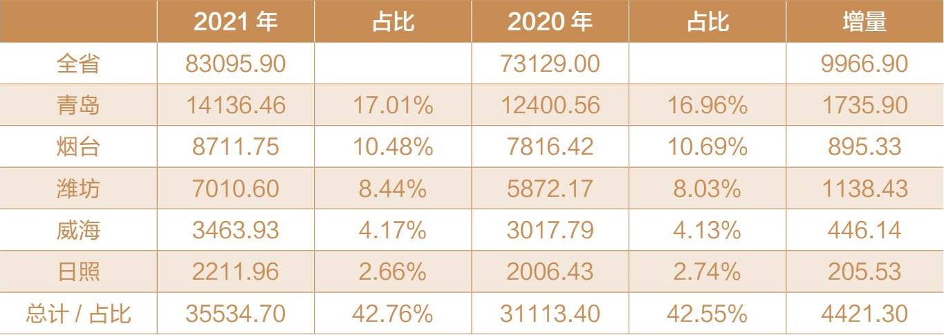 胶东经济圈5地市是山东省对外开放程度最高的地区,陆地面积达5.2万平方公里,海洋面积达13.3万平方公里,拥有丰富的海洋矿产和生物资源。2021年,胶东经济圈推进高水平对外开放,稳步扩大规则、规制、管理、标准等制度型开放,加快建设贸易强区,领先优势得以进一步巩固,2021年全年胶东5市实现GDp总和35534.7亿元,较2020年增长了4421.30亿元;在全省GDp比重由2020年的42.55%提高到2021年的42.76%;对全省经济增长的贡献率较2020年提高了2个百分点,达到43.2%(见图2-4)。2021年全省海洋生产总值达到1.49万亿元,比2020年增长15.7%,占全省GDp比重超过18%。经初步核算,2022年上半年5市GDp总和达到17699.89亿元,青岛市GDp总量为7070.35亿元,同比增长3.7%;烟台市GDp总量为4349.91亿元,同比增长4.5%;潍坊市GDp总量为3523亿元,同比增长3.7%;威海市GDp总量为1632.42亿元,同比增长3.4%;日照市GDp总量为1126.19亿元,同比增长3.8%。