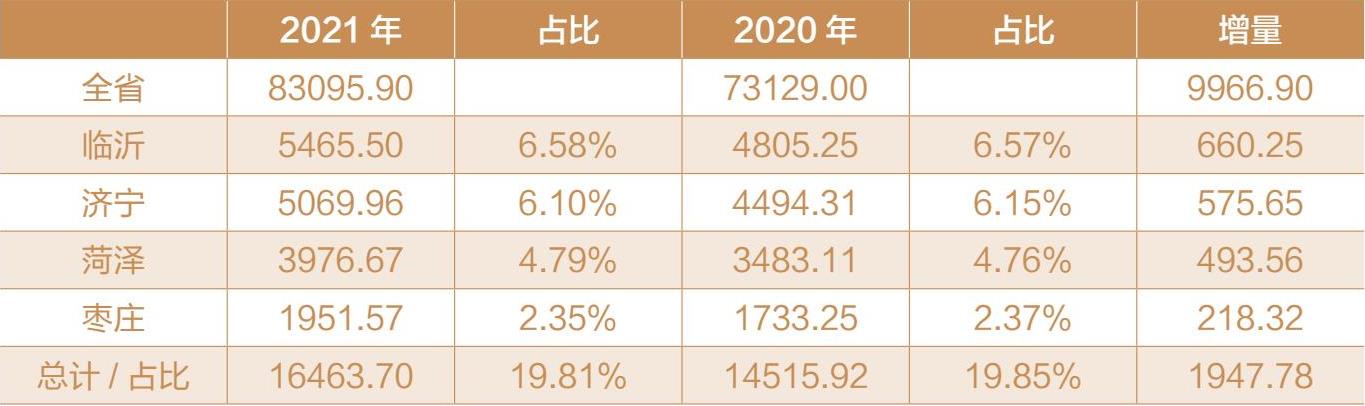 鲁南经济圈位于黄河、淮海和长江流域交界地带,连接山东沿海和中原地区,是山东省与安徽省、江苏省、河南省互通的重要桥梁。京沪、京九、鲁南高铁分段以及京台、济光高速公路途经鲁南经济圈,已建成菏泽牡丹机场,拥有代表性港口济宁港。经济总量不断增长,2021年,鲁南经济圈4市实现GDp总和16463.7亿元,较2020年增长1947.78亿元;对全省经济增长的贡献率由2020年的20.1%,提高到2021年的20.8%,提高了0.7个百分点。经初步核算,2022年上半年4市GDp总和达到8396.63亿元,临沂市GDp总量为2747.4亿元,同比增长3.7%;济宁市GDp总量为2580.37亿元,同比增长4.1%;菏泽市GDp总量为2063.42亿元,同比增长3.6%;枣庄市GDp总量为1005.44亿元,同比增长4.1%,