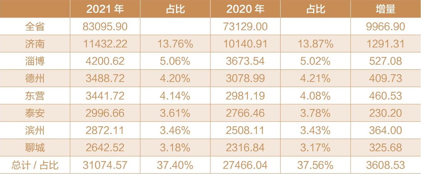,带动并引领周边城市的能力大幅提高。通过建立济南—淄博—泰安同城化的内核圈层,与聊城—德州—滨州—东营联动圈层形成融合互动,以黄河文化旅游生态带作为发展枢轴,推进生态走廊、特色产业和绿色经济的发展,建设和疏通泰安—济南—德州和淄博—济南—聊城的交通路线,为各类新兴产业发展提供保障。2021年全年,省会经济圈7市GDp总和为31074.6亿元,较2020年增长3608.5亿元,对全省经济增长的贡献率由2020年的38.7%下降至2021年的36.0%,下降了2.7个百分点。
