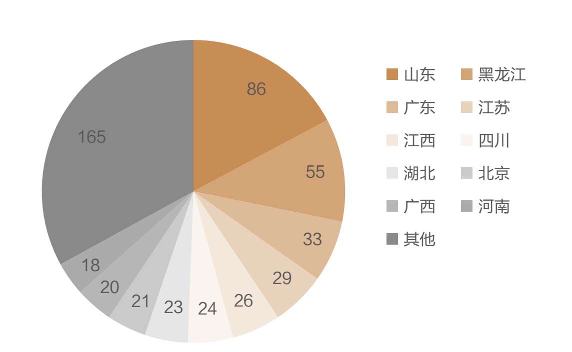 2021年山东省销售收入500万元以上农业产业化龙头企业超过1万家,其中,国家级龙头企业106家,实现销售收入15580亿元,带动农户超过1800万户,位居全国第一。全省率先基本完成土地登记确权颁证,截至2021年,全省农村土地流转面积达到3890.4万亩,占家庭承包经营耕地的42.3%,累计建成高标准农田6778万亩。农村土地经营规模化率达到40%。农民合作社、家庭农场、龙头企业等新型农业经营主体发展迅速,超过50万家。截至2021年,山东省农业产业集聚发展加快,累计创建国家级优势特色产业集群4个,现代农业产业园11个,特色农产品优势区17个,绿色发展先行区2个,农业产业强镇78个。2021年中国农业500强企业中,山东省有86家,位居全国第一(见图2-3)。