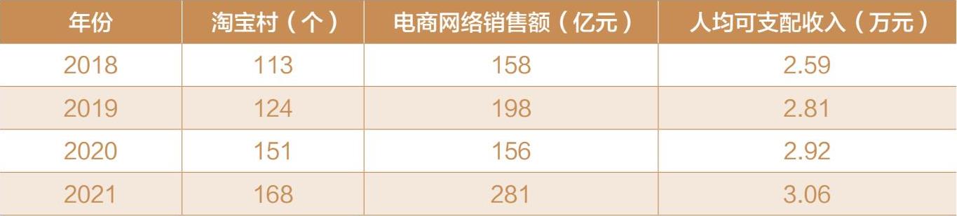 山东省借助电商的快速发展,积极推动农产品网络零售,2021年达到360.3亿元,总量居全国第5位,电商成为山东农产品销售的新渠道、新引擎。山东省菏泽市曹县面积1969平方公里,总人口175万,2021年已拥有168个淘宝村,成为仅次于义乌的全国第二“超大型淘宝村集群”。曹县有两大特色产品:木制品和演出服,是全国最大的桐木加工出口基地、全国最大的演出服和汉服基地。2018年曹县电商网络销售额为158亿元,尽管受到新冠肺炎疫情的影响,导致2020年销售额有所下降,但到2021年曹县电商网络销售额为281亿元,增长77.8%。截至2021年,曹县拥有电商企业5000余家,网店6万余个,亿级店铺6个、千万级店铺100多个,带动全县35万人创业就业,带动5万人返乡创业,2万人通过电商实现精准脱贫,占全县脱贫人口的20%。与此同时,曹县人民的口袋也逐渐富了起来,2018年曹县人均可支配收入为2.59万元,2021年为3.06万元,同比增长18.1%(见表2-9)。