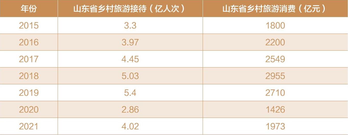2015年全省乡村旅游接待3.3亿人次、实现旅游消费1800亿元;2019年全省乡村旅游接待5.4亿人次,增长63.6%,实现旅游消费2710亿元,增长50.6%。受新冠肺炎疫情影响,2020年乡村旅游接待2.86亿人次,实现旅游消费1426亿元。2021年,全省接待乡村旅游游客4.02亿人次,同比增长40.8%,实现乡村旅游消费总额1973亿元,同比增长38.3%(见表2-10)。还培育了一批乡村旅游集群片区、精品旅游小镇、乡村旅游示范园区;拥有全国乡村旅游重点镇3个、全国乡村旅游重点村7个,山东省乡村旅游重点村60个、景区化村庄285个。