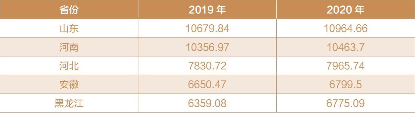 2021年全省粮食产业工业总产值为4975亿元,产值占全国的12%,连续多年稳居全国首位(见表2-7)。农业科技创新迈出新步伐,物质技术装备条件极大改善,农作物耕种收综合机械化率达到83%,农业科技进步贡献率达到63.27%。2020年,山东省农业机械总动力10964.66万千瓦,位居全国第一(见表2-8)。