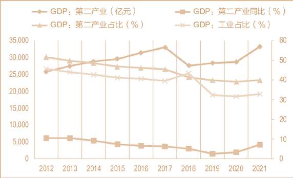注:第二产业总产值在主坐标轴,同比增长率和第二产业增加值占比和工业占比在次坐标轴。